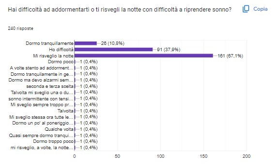 I partecipanti al sondaggio hanno ammesso di avere difficoltà ad addormentarsi e, nello specifico, il 67.1% ammette di risvegliarsi durante la notte. Solo il 10.8% affermerebbe di dormire tranquillamente.