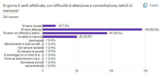 Emergono, inoltre, altri dati su cui riflettere: il 60.4% degli utenti si dice affaticato nell’arco della giornata e con difficoltà di attenzione (39.2%).