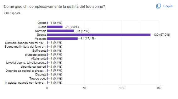 L’ultima parte del sondaggio è incentrata proprio sulla qualità del proprio sonno: per il 57.9% è scarsa, seguita da normale (15%) e solo per lo 0.4% è ottima.