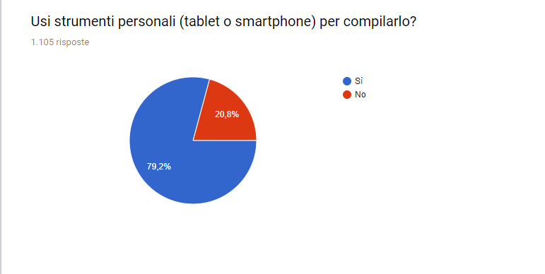 L’aspetto maggiormente critico emerso dal questionario è però quello relativo all’uso dei dispositivi dei docenti per compilare il registro elettronico. Infatti, il 79,2% degli insegnanti che hanno risposto al questionario riferisce di utilizzare il proprio smartphone o tablet per compilare il registro elettronico, contro il 20,8% che invece lavora secondo la normativa. Infatti, ricordiamo che nessun insegnante può essere obbligato a utilizzare i propri strumenti per la compilazione degli atti della scuola, come il registro elettronico. Infatti, nel caso di adozione dello strumento, la scuola si impegna a garantire la strumentazione idonea per il personale, quindi predisporre l’acquisto di tablet, pc e connessione a internet, in modo da consentire a tutti, in tempo reale, l’utilizzo dello strumento e senza dover chiedere al personale stesso l’uso dei propri dispositivi.