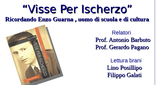 Dopo i saluti della Prof.ssa Sina Pugliese Montebello, Presidente dell’Università della Terza Età l’iniziativa dal titolo ” ‘Visse Per Ischerzo’ – ricordando Enzo Guarna , uomo di scuola e di cultura” si svilupperà con le relazioni del Prof. Antonio Barbuto e del Preside Gerardo Pagano, seguiranno la lettura dei brani di alcuni scritti di Guarna da parte di Lino Posillipo e Filippo Galati ed in conclusione l’intervento dei figli Francesca e Fabio.