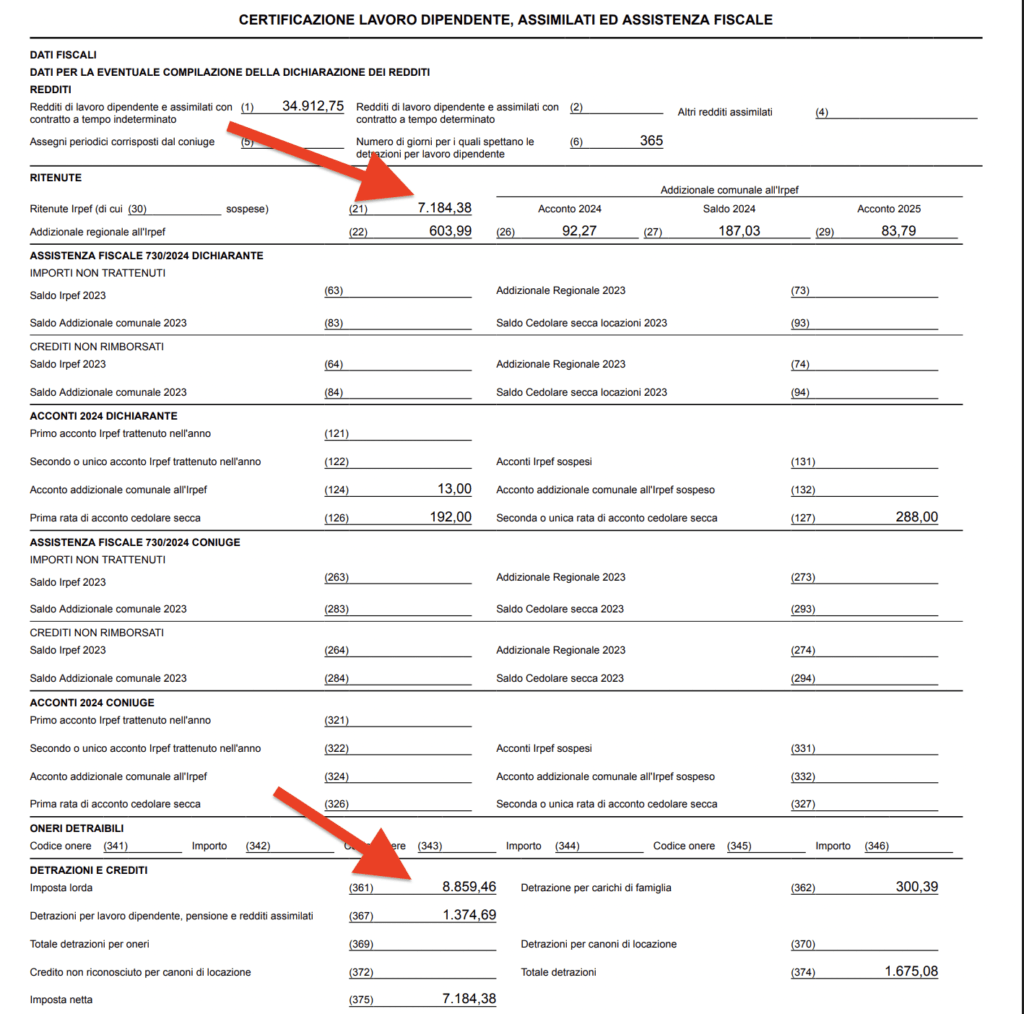 In una CU (Certificazione Unica) del 2025 vediamo una situazione del genere: