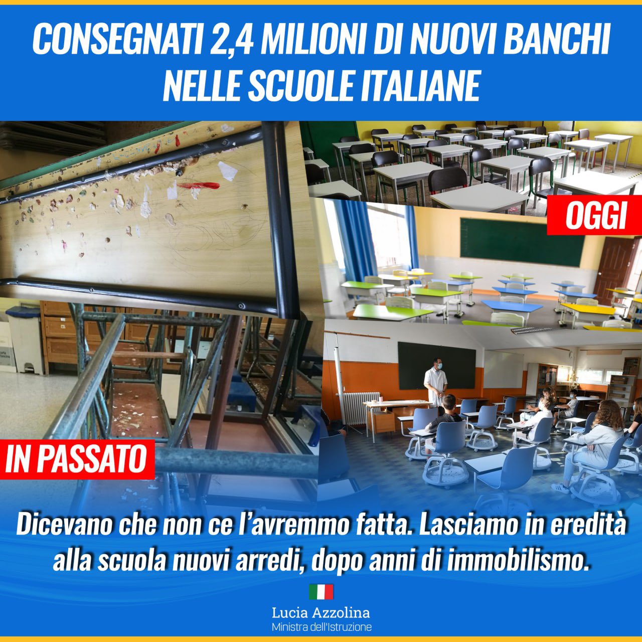 Com’è naturale, la Ministra difende il proprio operato: ” Dicevano che non ce l’avremmo fatta. Che i banchi non sarebbero mai arrivati. Abbiamo letto e ascoltato di tutto, compresi conteggi fuori dal mondo sui costi di questa operazione. Abbiamo risposto con i fatti. Fino a ieri migliaia di studentesse e studenti facevano didattica sugli stessi banchi dei nonni. Questa squadra lascia in eredità alla scuola nuovi arredi, dopo anni di immobilismo.”
