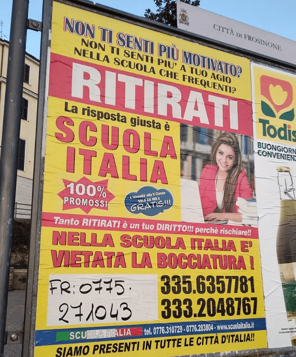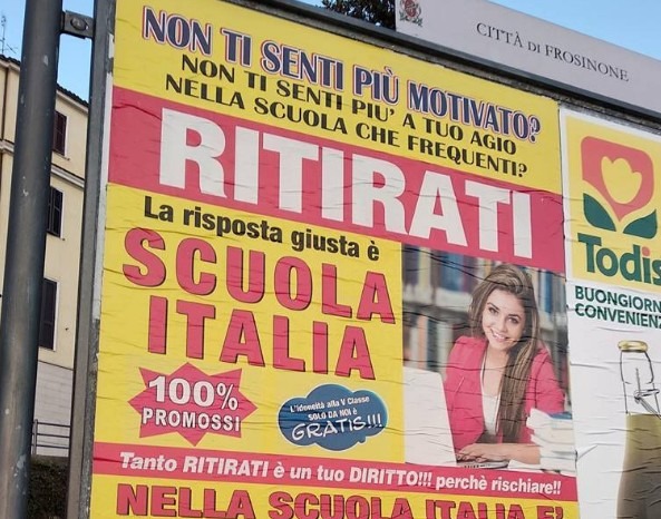 L’istituto, con sede legale a Cassino, ha affisso diversi cartelloni con un messaggio choc: “Nella Scuola Italia 100% promossi: vietata la bocciatura”. E ancora: “se non ti senti motivato, la risposta giusta è “ritirati e frequenta la scuola privata”.