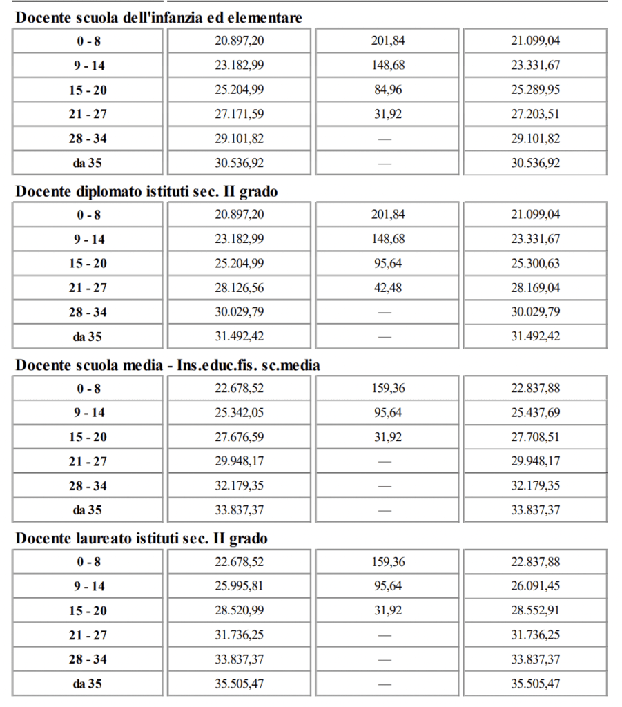 Le classi stipendiali dei docenti sono 6, la prima classe indicata con “0” è quella che va da 0 ad 8, la seconda è quella che va da 9 a 14 e si indica nel cedolino con 9, la terza va da 15 a 20 e si indica con 15, la quarta va da 21 a 27 e si indica con 21, poi c’è la classe stipendiale 28 che va da 28 a 34 anni ed infine c’è la sesta ed ultima classe che è la 35 fino alla pensione.
