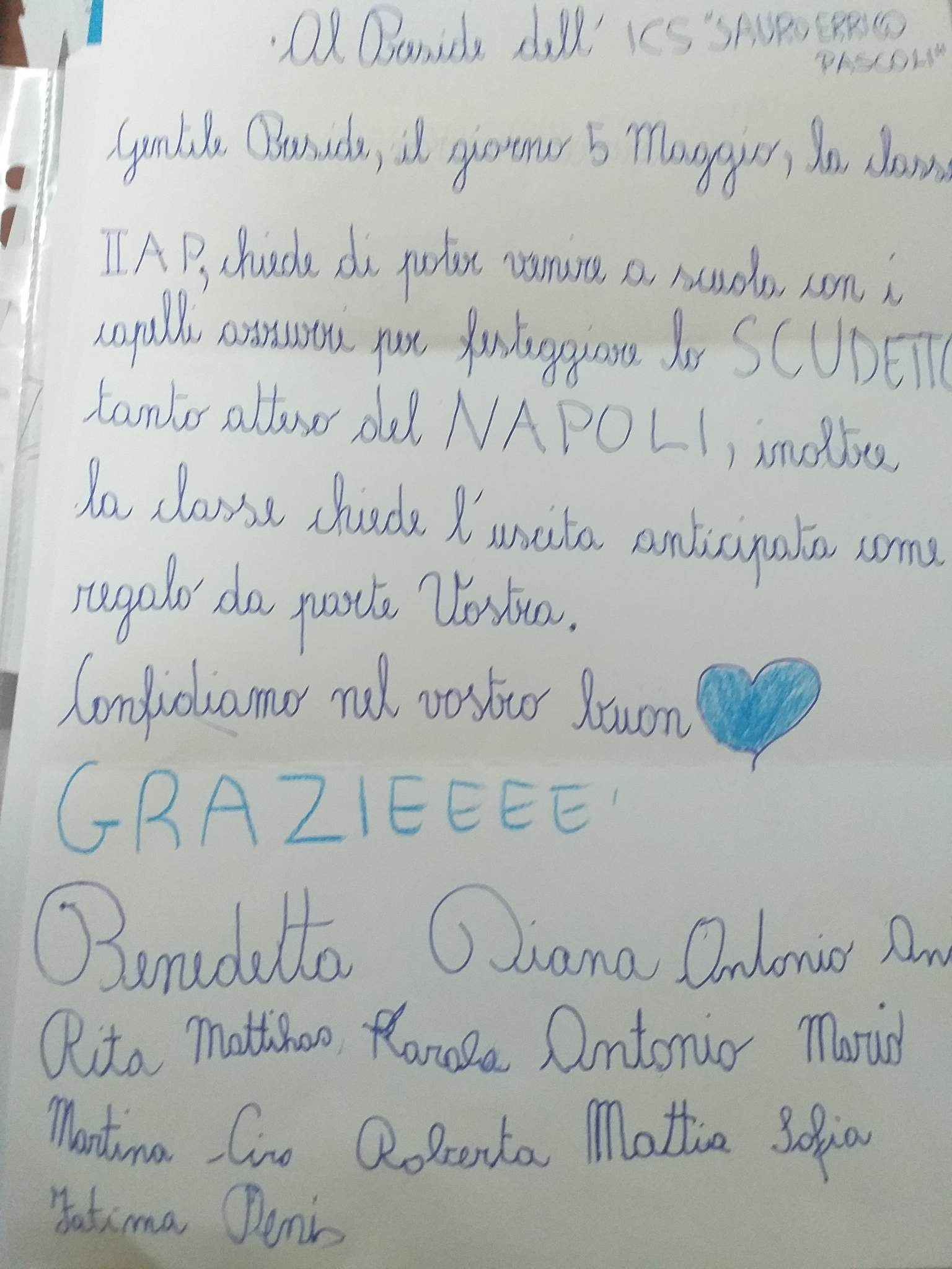 La richiesta è stata espressa con una letterina scritta a mano che i piccoli alunni dell’Istituto comprensivo Sauro-Errico-Pascoli di Napoli hanno consegnato al preside direttamente nel suo ufficio. “La classe IIAp chiede di poter venire a scuola con i capelli azzurri per festeggiare lo scudetto tanto atteso del Napoli. Inoltre la classe chiede l’uscita anticipata come regalo da parte vostra. Confidiamo nel vostro buon cuore. Grazie”, questo il contenuto del messaggio.