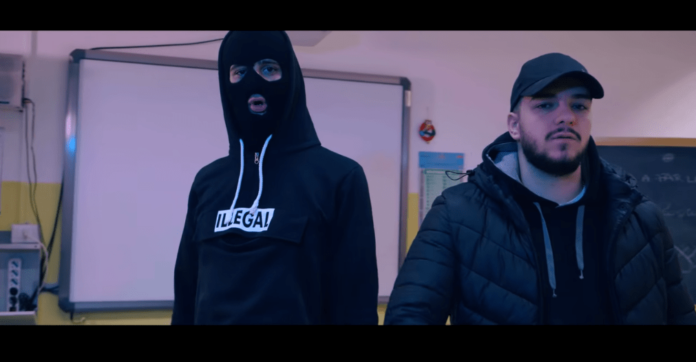 In tutto ciò si vedono i due ragazzini in atteggiamenti finto “gangsta”: il volto travisato dal passamontagna, il fumo, una mazza tra le mani, in piedi sui banchi.