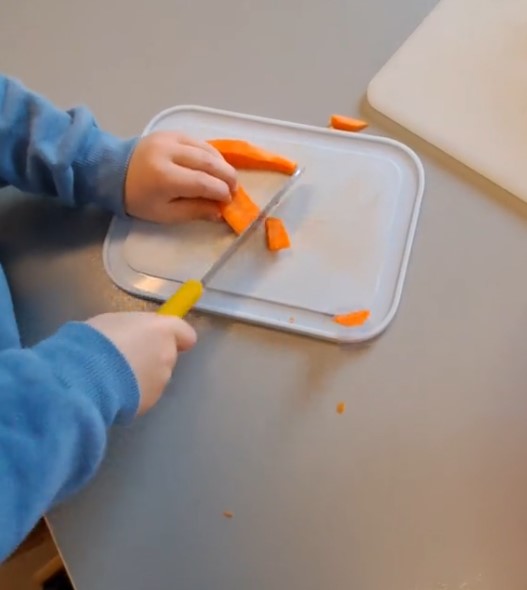 Nel video si vedono bambini e bambine che affettano delle carote usando un coltello vero e che tagliano i rami di un alberello muniti di un seghetto in piena regola.