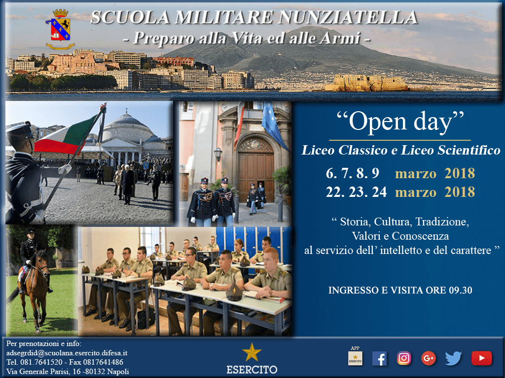 Dal 6 al 9 marzo e dal 22 al 24 marzo la Scuola militare “Nunziatella” di Napoli organizzerà giornate di orientamento per divulgare tra i giovani studenti attività e finalità dell’istituto (Liceo classico e Liceo scientifico).