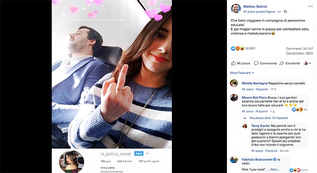 La stessa ragazza, spiegherà sui social: “Questa foto l’ho condivisa con i miei amici per evidenziare l’incredibile coincidenza di prendere un volo low-cost e ritrovarsi seduti insieme a Salvini. Il gestaccio era, piuttosto, rivolto alle persone a cui ho inviato la foto privatamente e nulla aveva a che vedere con Salvini”.