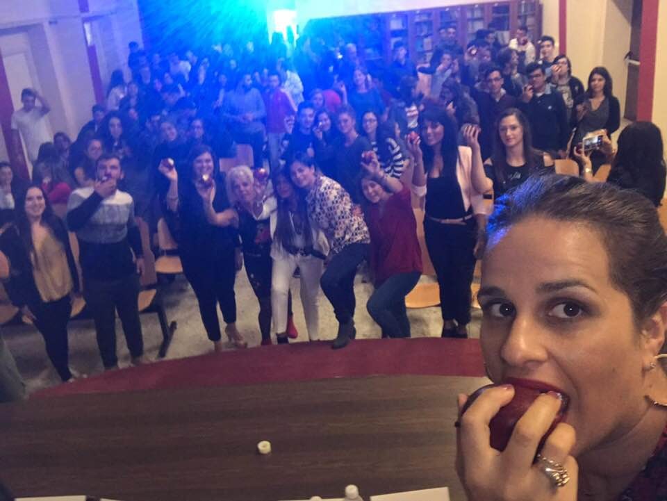 Alla fine del dibattito tutti i partecipanti insieme ai ragazzi hanno dato vita ad un flash mob arricchito da particolari di colore rosso e dal morso alle mele.