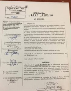 In considerazione delle avverse condizioni meteorologiche, la Sindaca di Roma, Virginia Raggi, ha emesso una ordinanza di sospensione delle attività educative e didattiche delle scuole della Capitale per tutta la giornata di domani 29 ottobre 2018.