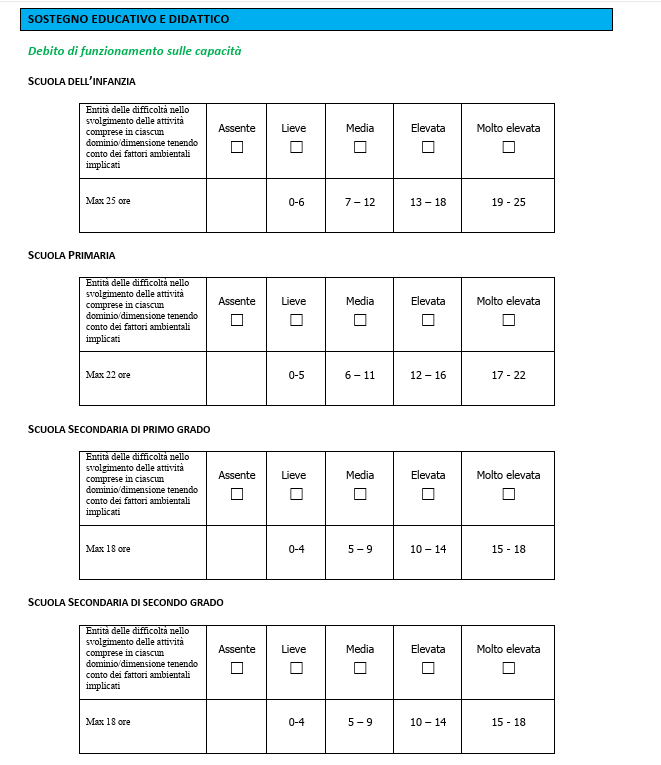 In particolare, si tratta della “Tabella Fabbisogno Risorse professionali per il sostegno didattico e l’assistenza“. Il massimo, alla scuola dell’infanzia, è 25 ore, alla primaria 22, alla secondaria 18.