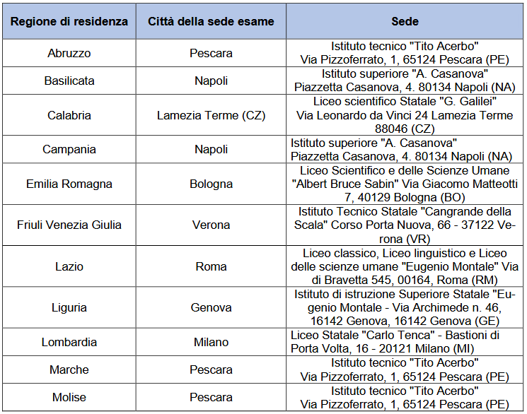 Di seguito si riportano le sedi di esame per il 20 dicembre: