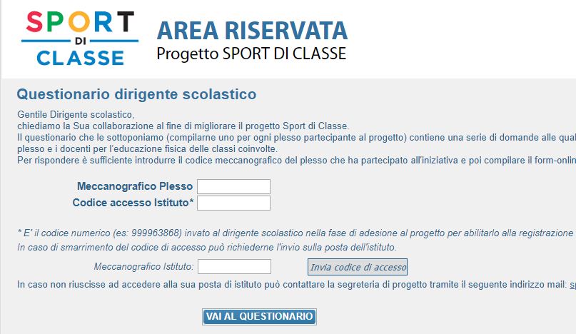 Come per le precedenti edizioni del progetto nazionale Sport in Classe, anche per l’edizione 2016/2017 è richiesta la compilazione, da parte dei Dirigenti scolastici delle scuole partecipanti, di un questionario.