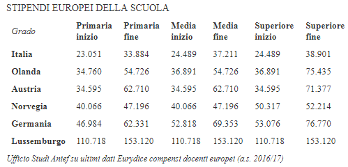 In Germania – segnala Anief – un maestro della primaria tedesco appena assunto percepisce 46.984 euro di media, fino a superare i 62 mila euro prima di andare in pensione, mentre in Italia nessun docente supererà mai i 34 mila euro; alle scuole medie, il collega tedesco sfiora i 53 mila euro all’inizio e i 70 mila euro a fine carriera; alle superiori, infine, si vede assegnare 53 mila euro come primo stipendio da neo-assunto (20 mila più dei nostri) e 76.770 euro come stipendio massimo: quasi il doppio rispetto ad un docente delle superiori non va oltre ai 39 mila euro annui.