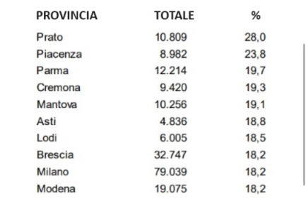 Secondo i dati ufficiali relativi all’anno scolastico 2020/21 queste sono le percentuali di stranieri nelle province a più alta presenza di non italiani