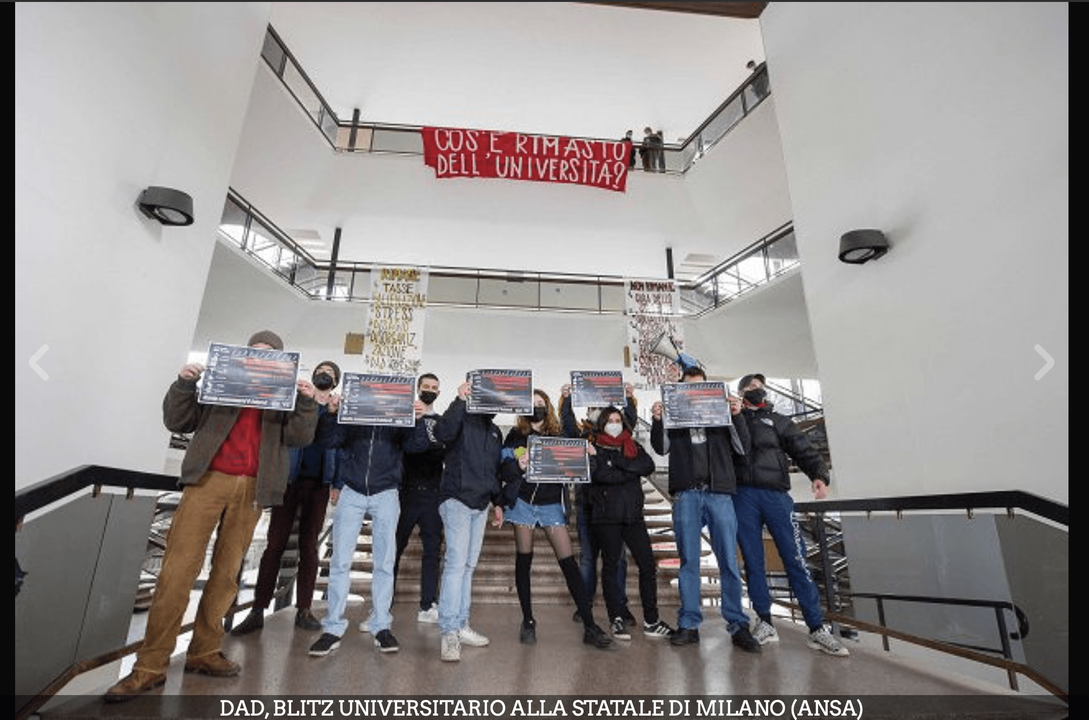 Dopo gli studenti delle scuole superiori, le proteste sembra stiano contagiando anche i giovani dell’università, stanchi di Dad e di soli contatti online. E così degli studenti del collettivo Kasciavit hanno appeso alla Statale di Milano un grande striscione rosso su cui si legge: “Cos’è rimasto dell’università?”. “Tasse, alienazione, stress, disagio, disorganizzazione, Dad”.