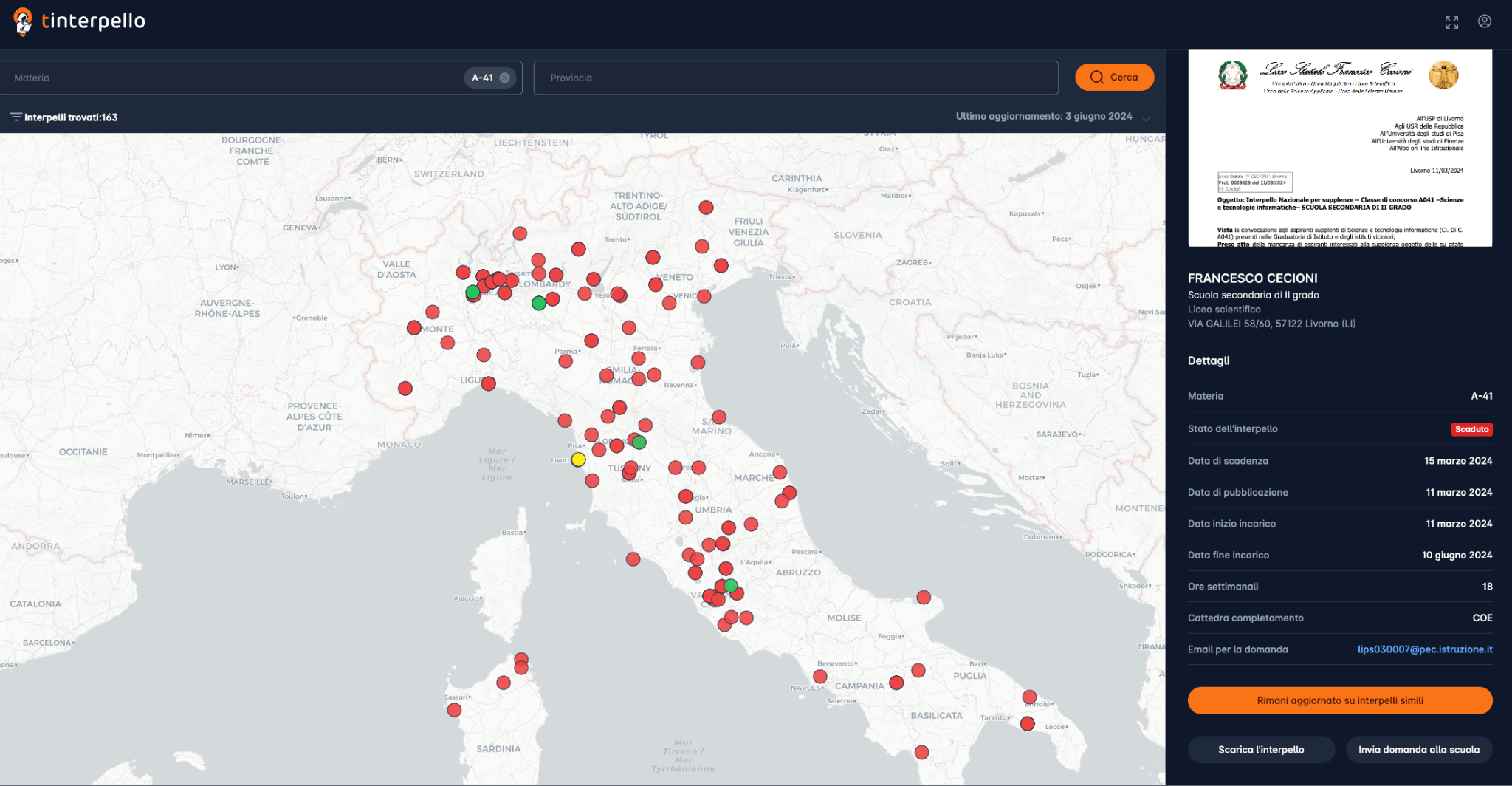 A giorni sarà possibile abbonarsi al servizio di notifica personalizzata degli interpelli ed invio automatico della propria candidatura. La visualizzazione su mappa di tutti gli interpelli pubblicati dalle scuole italiane rimarrà comunque gratuita.
