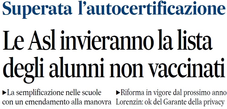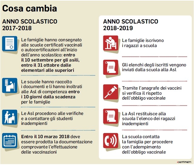 Dal prossimo anno sarà l’anagrafe vaccinale a ridurre i tempi e disagi per le famiglie e a comunicare direttamente con le scuole. Gli istituti forniranno alle Asl gli elenchi degli iscritti e successivamente le Asl stesse comunicheranno alle scuole l’elenco degli alunni inadempienti.