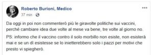Immediata la replica del virologo Roberto Burioni, che su Facebook ha scritto: “Da oggi in poi non commenterò più le giravolte politiche sui vaccini, perché cambiare idea due volte al mese va bene, tre volte al giorno no. Ps: informo che il vaccino contro il solo morbillo non esiste, non esisterà mai e se un dì esistesse se lo inietterebbero solo i pazzi per motivi che presto vi spiegherò”.