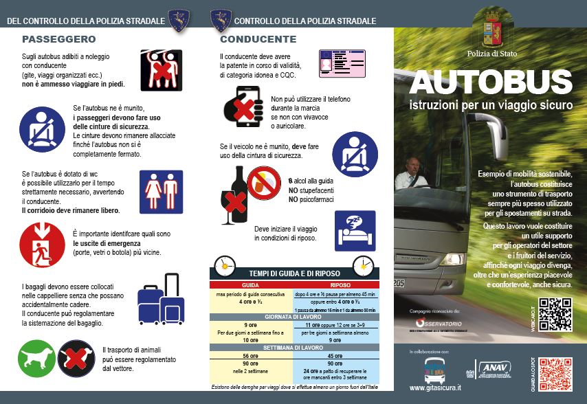 A queste e ad altre domande risponde il vademecum “Autobus – istruzioni per un viaggio sicuro”, realizzato dalla Polizia Stradale in collaborazione con Anav (Associazione nazionale autotrasporto viaggiatori).